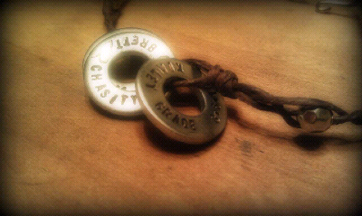 LARGE 1" TAG HAND STAMPED WITH 'MERRY CHRISTMAS,' I CAN PERSONALIZE THIS HOWEVER YOU'D LIKE...ACCENTED BY A SMALL TAG HAND STAMPED W '2011' AND THREE CHRISTMAS-Y DANGLE CHARMS AS WELL AS A SMALL JINGLE BELL...STRUNG BUY A MULTI-STRAND GENUINE LEATHER THREAD...